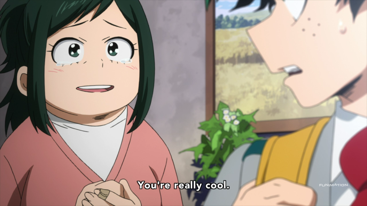 “Cuando tomabas una siesta mientras estudiabas vi tu cuaderno. Las horribles cosas que te dije siguen molestándome. Me rendí en ese entonces. Lo siento Izuku. Voy a apoyarte abiertamente en todo lo que hagas de ahora en adelante” – Entré en coma diabético. La madre de Izuku es un ama de casa típica japonesa; sin embargo, su rol en la serie es activo, especialmente con el rol que cumple para con su hijo. Inko es un apoyo constante, es aquella persona que está siempre allí preocupada por el bienestar de su pequeño. Las cortas escenas de ella preocupada, alegre y sufriendo también junto con su hijo no hacen más que dejarme en un estado de satisfacción plena y derritiéndome en mi asiento con una sonrisa y lágrimas en mis ojos, pues en solo segundo dice mucho de su papel y su relación con Deku. No solo la escena de ella esperando afuera del cuarto de su hijo igual de nerviosa por saber el resultado de la admisión, sus ojos llenos de lágrimas al ver la sonrisa de su hijo anunciándole que estaba un paso más adelante de su sueño, sus disculpas y promesas de apoyo eterno ante cualquier sueño que su hijo tenga o elaborado el traje de superhéroe que, basándose en el dibujo de su hijo, hizo en muestra de apoyo incondicional. Hasta el momento la mejor escena es la famosa “You’re really cool” (kakkoii). Solo en una frase logró emocionar a más de uno y llevar un mensaje que no hizo más que sacarme ciertas lágrimas de los ojos. Pudo decir miles de cosas en esa escena pero creo que ninguna que lograra lo que esa frase ocasionó en mí.